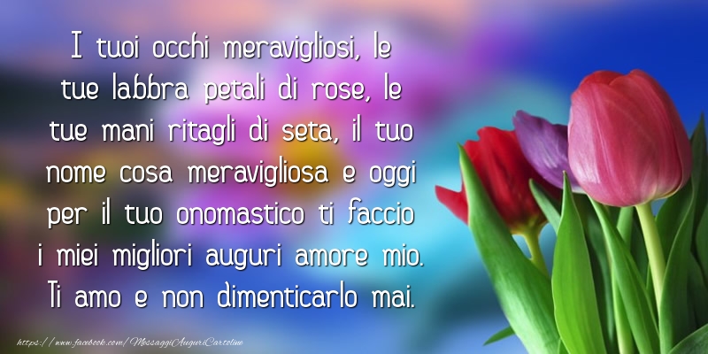 I tuoi occhi meravigliosi, le tue labbra petali di rose, le tue mani ritagli di seta, il tuo nome cosa meravigliosa e oggi per il tuo onomastico ti faccio i miei migliori auguri amore mio. Ti amo e non dimenticarlo mai.