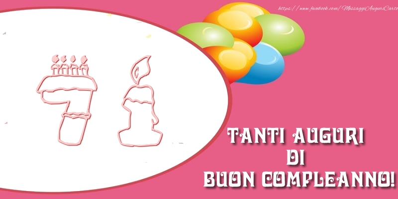 A 71 anni, vi abbracciamo con gratitudine per ogni anno trascorso intorno al sole. Ogni biglietto è una celebrazione del vostro bagaglio di esperienze e del valore che apportate alla vita di chi vi circonda. Il biglietto cespugli di palloncini per il compimento dei 71 anni può essere scaricato gratuitamente o inviato sui social media. L'immagine misura [L] x 400px e il testo Tanti auguri di buon compleanno per 71 anni!.