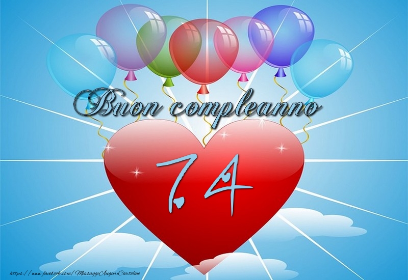 A 74 anni, siete un tesoro di storie e successi. Ogni biglietto è un viaggio nel passato, un ricordo dei successi e delle gioie vissute e uno sguardo entusiasta a ciò che vi aspetta. Tanti auguri per una vita di soddisfazioni e di appagamento! Il biglietto di auguri per il 74 compleanno con cuore e palloncini può essere scaricato gratuitamente o inviato sui social media. L'immagine misura [L] x 550px e il testo 74 anni, Buon compleanno!.