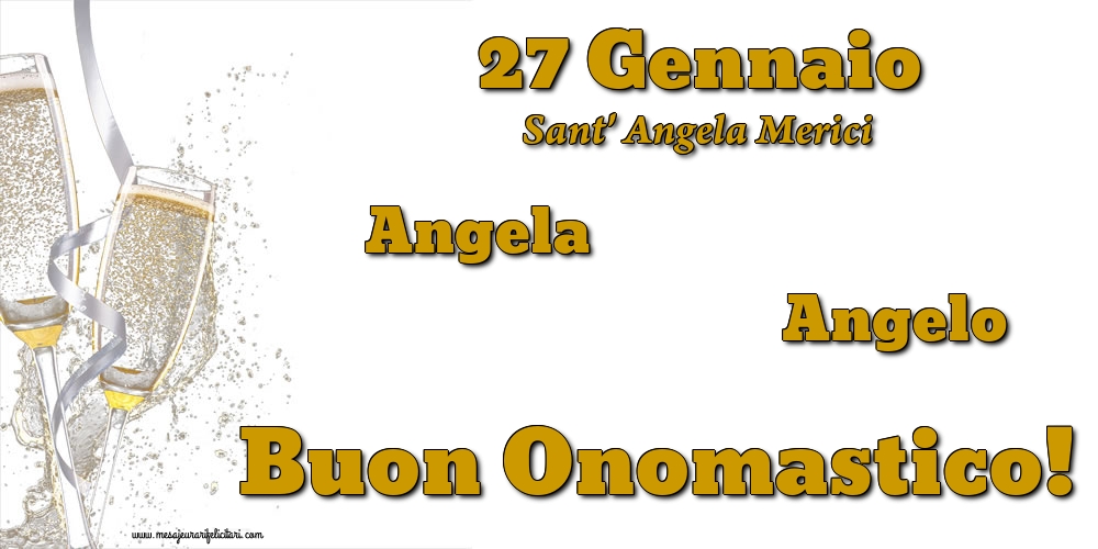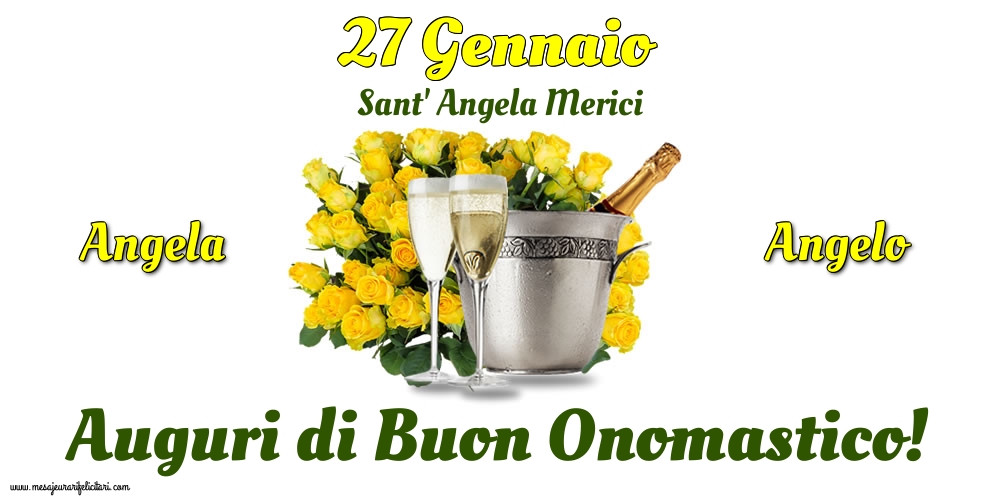 27 Gennaio - Sant' Angela Gli auguri più sinceri ed affettuosi per il tuo onomastico! Ti voglio bene. Tantissimi auguri di buon onomastico Angela! 27 Gennaio Sant' Angela 27 Gennaio Sant' Angela Tantissimi auguri di buon onomastico Angela e Angelo! 27 Gennaio Sant' Angela Tantissimi auguri di buon onomastico Lina e Lino! Tantissimi auguri di buon onomastico Angelo! 27 Gennaio Sant' Angela 27 Gennaio Sant' Angela Tantissimi Auguri di Buon Onomastico!