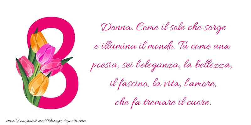 Donna. Come il sole che sorge e illumina il mondo. Tu come una poesia, sei l'eleganza, la bellezza, il fascino, la vita, l'amore, che fa tremare il cuore.