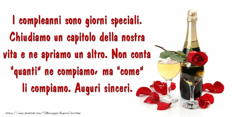 I compleanni sono - I compleanni sono giorni speciali. Chiudiamo un capitolo della nostra vita e ne apriamo un altro. Non conta “quanti” ne compiamo, ma “come” li compiamo. Auguri sinceri. - Auguri