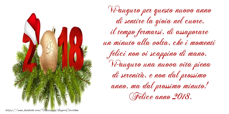 Vi auguro per questo nuovo anno di sentire la gioia nel cuore, il tempo fermarsi, di assaporare un minuto alla volta, che i momenti felici non vi scappino di mano. Vi auguro una nuova vita piena di serenità, e non dal prossimo anno, ma dal prossimo minuto! Felice anno 2018.