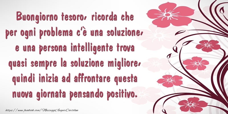 Buongiorno tesoro, ricorda che per ogni problema c'è una soluzione, e una persona intelligente trova quasi sempre la soluzione migliore, quindi inizia ad affrontare questa nuova giornata pensando positivo.