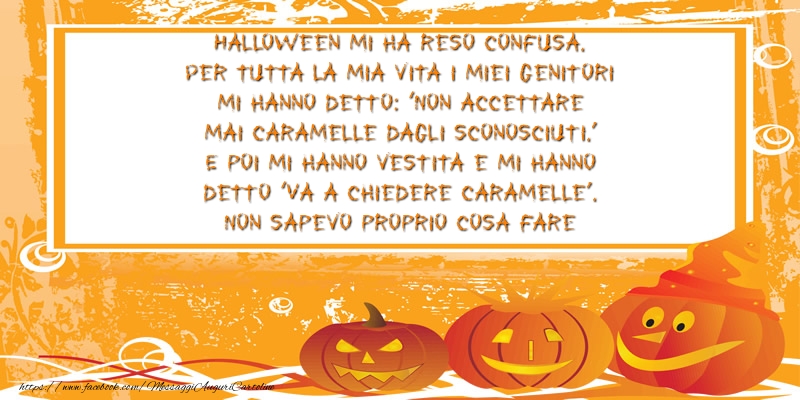 Halloween mi ha reso confusa. Per tutta la mia vita i miei genitori mi hanno detto: ‘Non accettare mai caramelle dagli sconosciuti.’ E poi mi hanno vestita e mi hanno detto ‘Va a chiedere caramelle’. Non sapevo proprio cosa fare
