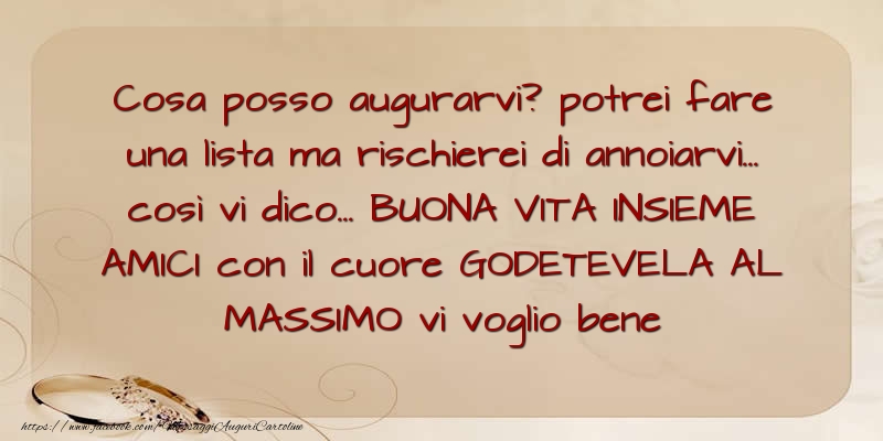 Cosa posso augurarvi? potrei fare una lista ma rischierei di annoiarvi... così vi dico... BUONA VITA INSIEME AMICI con il cuore GODETEVELA AL MASSIMO vi voglio bene