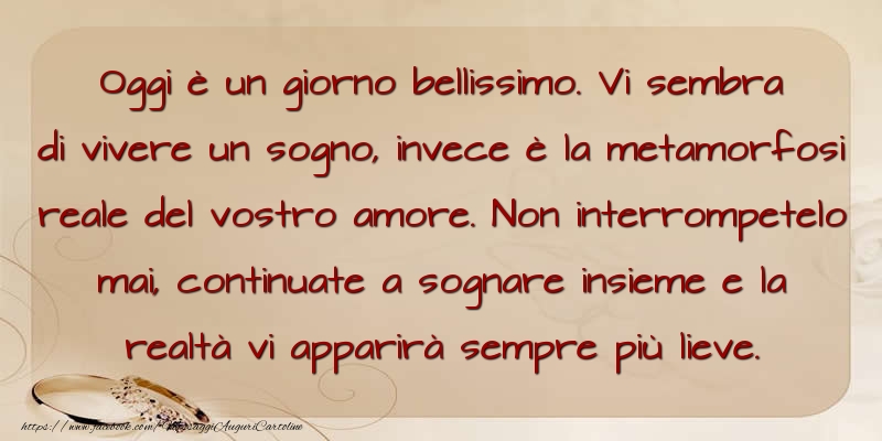 Oggi è un giorno bellissimo. Vi sembra di vivere un sogno, invece è la metamorfosi reale del vostro amore. Non interrompetelo mai, continuate a sognare insieme e la realtà vi apparirà sempre più lieve.