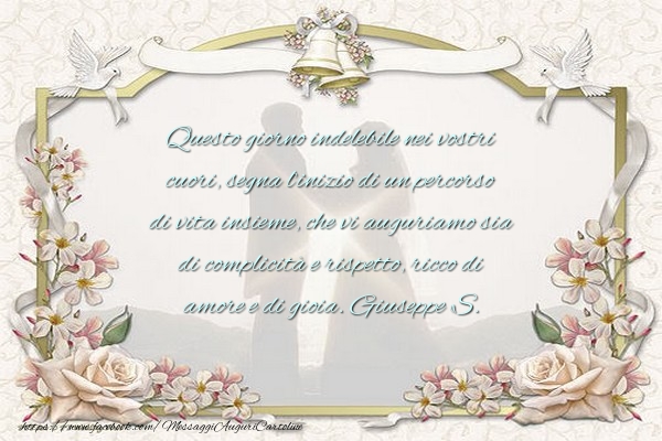 Questo giorno indelebile nei vostri cuori, segna l’inizio di un percorso di vita insieme, che vi auguriamo sia di complicità e rispetto, ricco di amore e di gioia. Giuseppe S.