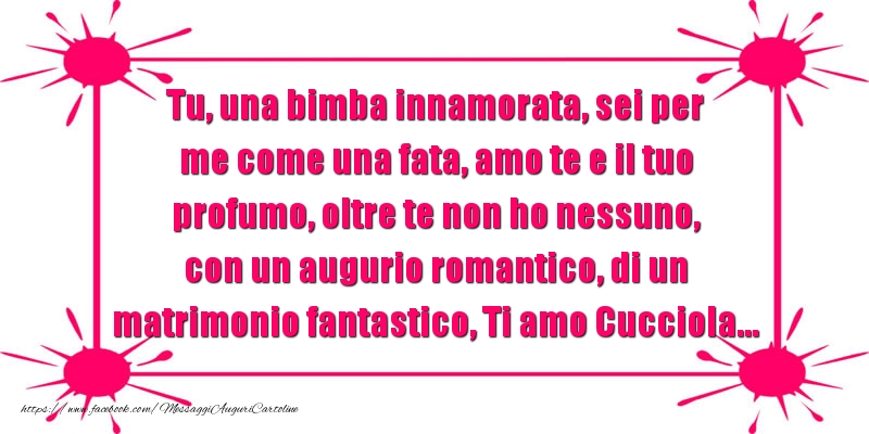 Tu, una bimba innamorata, sei per me come una fata, amo te e il tuo profumo, oltre te non ho nessuno, con un augurio romantico, di un matrimonio fantastico, Ti amo Cucciola...