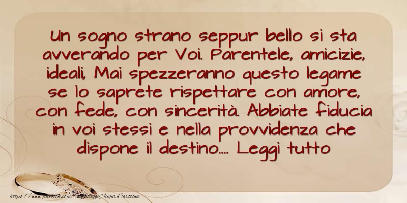 Un sogno strano seppur bello si sta avverando per Voi. Parentele, amicizie, ideali, Mai spezzeranno questo legame se lo saprete rispettare con amore, con fede, con sincerità. Abbiate fiducia in voi stessi e nella provvidenza che dispone il destino.... Leggi tutto