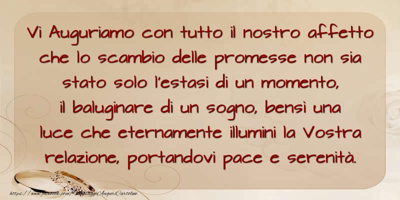 Vi Auguriamo con tutto il nostro affetto che lo scambio delle promesse non sia stato solo l'estasi di un momento, il baluginare di un sogno, bensì una luce che eternamente illumini la Vostra relazione, portandovi pace e serenità.