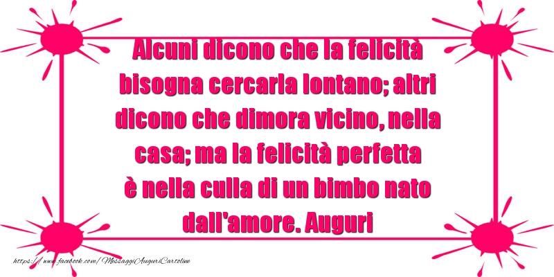 Alcuni dicono che la felicità bisogna cercarla lontano - Alcuni dicono che la felicità bisogna cercarla lontano; altri dicono che dimora vicino, nella casa; ma la felicità perfetta è nella culla di un bimbo nato dall'amore. Auguri - Nascita