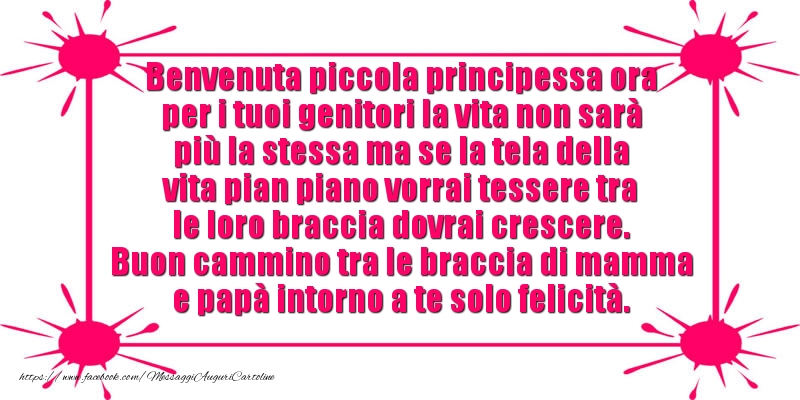 Benvenuta piccola principessa ora per i tuoi genitori la vita non sarà più la stessa ma se la tela della vita pian piano vorrai tessere tra le loro braccia dovrai crescere. Buon cammino tra le braccia di mamma e papà intorno a te solo felicità.