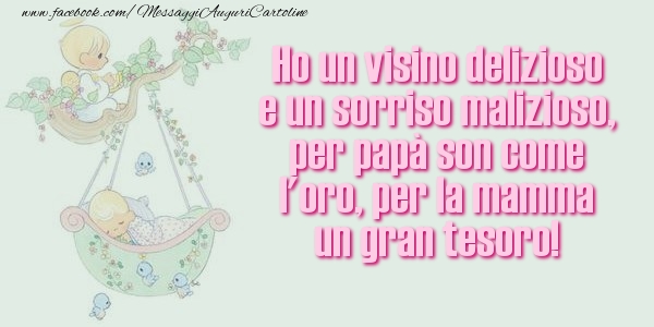 Ho un visino delizioso e un sorriso malizioso, per papà son come l'oro, per la mamma un gran tesoro!