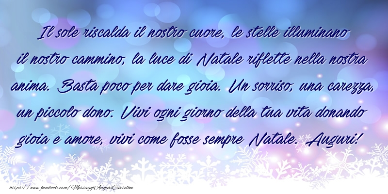 Il sole riscalda il nostro cuore, le stelle illuminano il nostro cammino, la luce di Natale riflette nella nostra anima. Basta poco per dare gioia. Un sorriso, una carezza, un piccolo dono. Vivi ogni giorno della tua vita donando gioia e amore, vivi come fosse sempre Natale. Auguri!