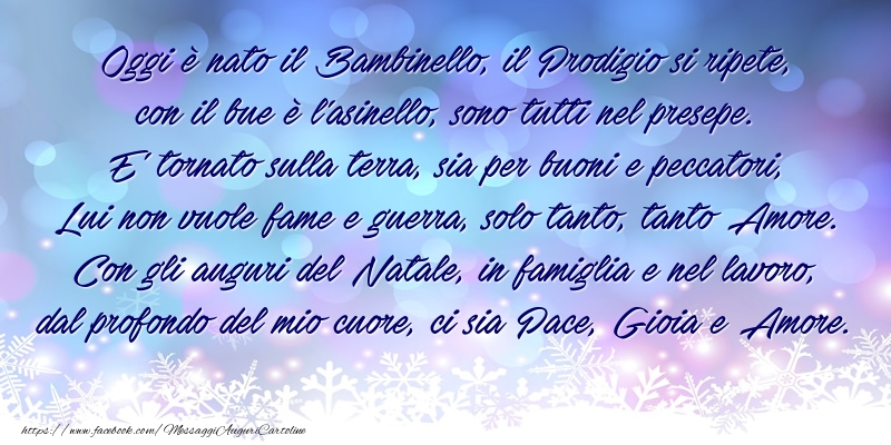 Oggi è nato il Bambinello, il Prodigio si ripete, con il bue è l'asinello, sono tutti nel presepe. E' tornato sulla terra, sia per buoni e peccatori, Lui non vuole fame e guerra, solo tanto, tanto Amore. Con gli auguri del Natale, in famiglia e nel lavoro, dal profondo del mio cuore, ci sia Pace, Gioia e Amore.