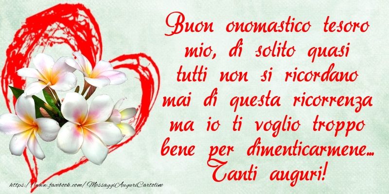 Buon onomastico tesoro mio, di solito quasi tutti non si ricordano mai di questa ricorrenza ma io ti voglio troppo bene per dimenticarmene... Tanti auguri!
