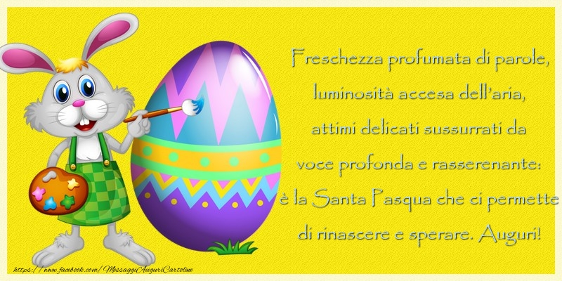 Freschezza profumata di parole, luminosità accesa dell’aria, attimi delicati sussurrati da voce profonda e rasserenante: è la Santa Pasqua che ci permette di rinascere e sperare. Auguri!