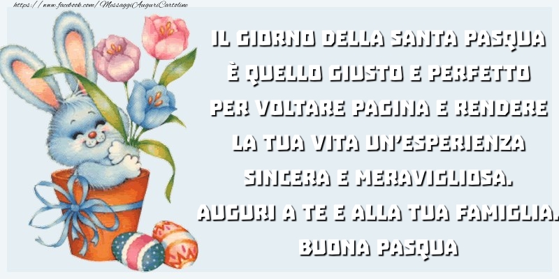 Il giorno della Santa Pasqua è quello giusto e perfetto per voltare pagina e rendere la tua vita un’esperienza sincera e meravigliosa. Auguri a te e alla tua famiglia. Buona Pasqua