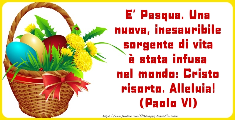 E’ Pasqua. Una nuova, inesauribile sorgente di vita è stata infusa nel mondo: Cristo risorto. Alleluia! (Paolo VI)
