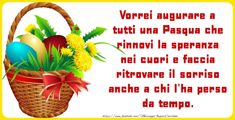 Vorrei augurare a tutti una Pasqua che rinnovi la speranza nei cuori e faccia ritrovare il sorriso anche a chi l'ha perso da tempo.
