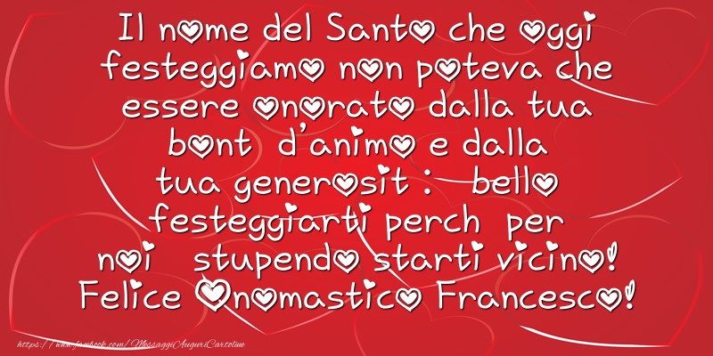 Il nome del Santo che oggi festeggiamo non poteva che essere onorato dalla tua bontà d’animo e dalla tua generosità: è bello festeggiarti perché per noi è stupendo starti vicino! Felice Onomastico Francesco!