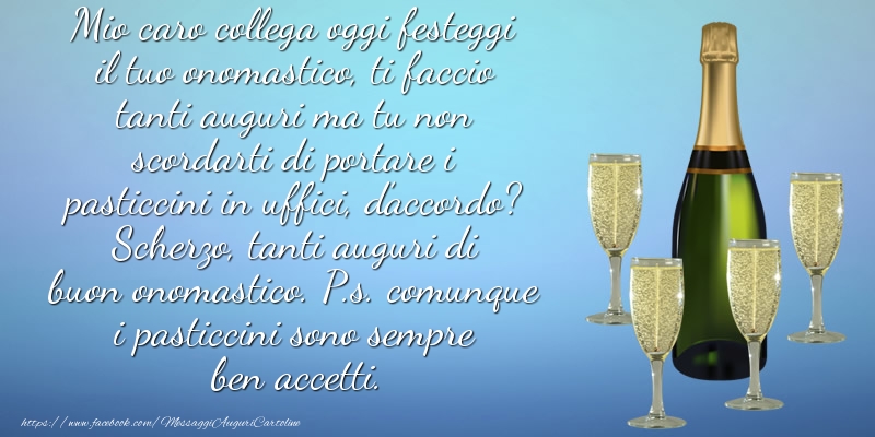 Mio caro collega oggi festeggi il tuo onomastico, ti faccio tanti auguri ma tu non scordarti di portare i pasticcini in uffici, d’accordo? Scherzo, tanti auguri di buon onomastico. P.s. comunque i pasticcini sono sempre ben accetti.