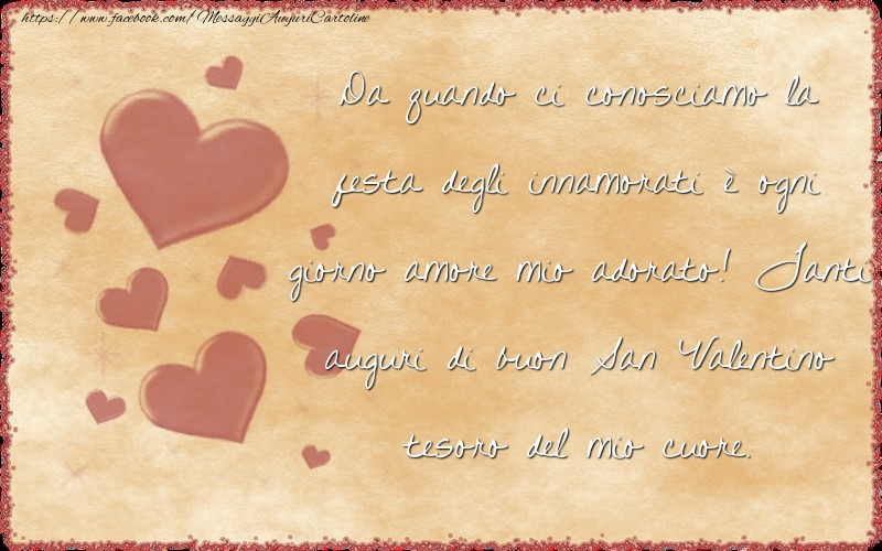 Da quando ci conosciamo la festa degli innamorati è ogni giorno amore mio adorato! Tanti auguri di buon San Valentino tesoro del mio cuore.