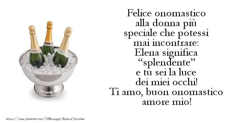 Felice onomastico alla donna più speciale che potessi mai incontrare: Elena significa “splendente” e tu sei la luce dei miei occhi! Ti amo, buon onomastico amore mio!