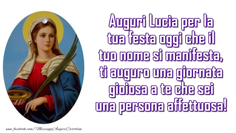 Auguri Lucia per la tua festa oggi che il tuo nome si manifesta, ti auguro una giornata gioiosa a te che sei una persona affettuosa!