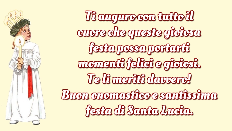 Ti auguro con tutto il cuore che queste gioiosa festa possa portarti momenti felici e gioiosi. Te li meriti davvero! Buon onomastico e santissima festa di Santa Lucia.