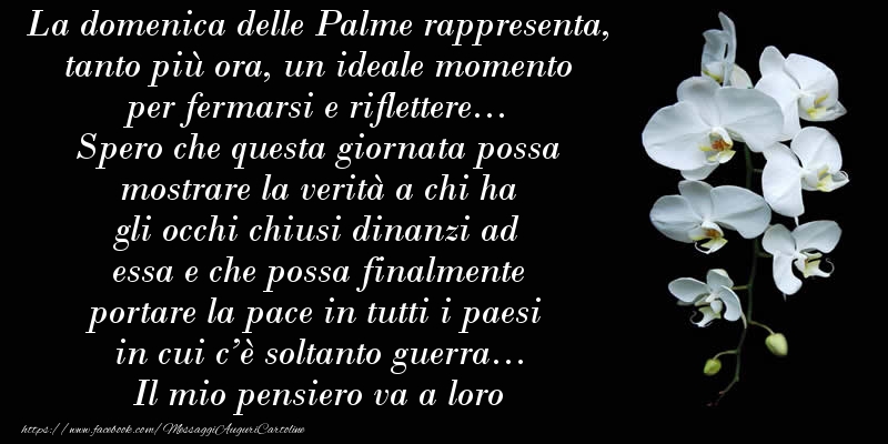 La domenica delle Palme rappresenta, tanto più ora, un ideale momento per fermarsi e riflettere… Spero che questa giornata possa mostrare la verità a chi ha gli occhi chiusi dinanzi ad essa e che possa finalmente portare la pace in tutti i paesi in cui c’è soltanto guerra… Il mio pensiero va a loro